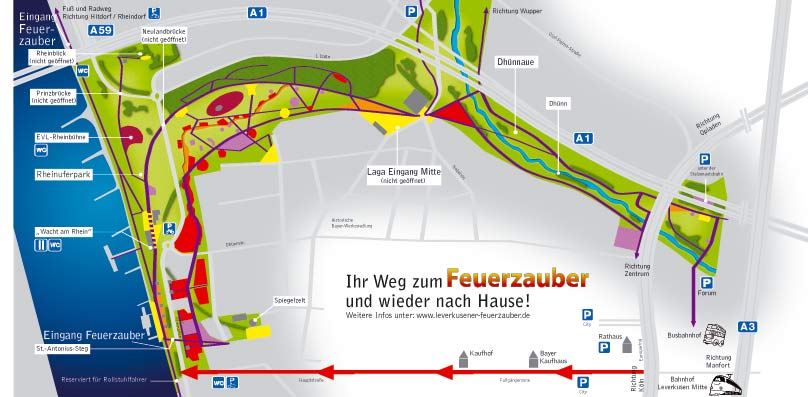 Die Besucher aus den Stadtteilen RHEINDORF, KÜPPERSTEG, BÜRRIG, WIESDORF UND MANFORT werden aufgefordert, mit dem Fahrrad oder zu Fuß zum Feuerzauber zu kommen. Da die Innenstadt für den Fahrzeugverkehr gesperrt wird, kommen Sie weder mit dem Auto noch mit dem Bus nahe genug an das Veranstaltungsgelände heran, als dass Sie dadurch Zeit sparen würden. Ganz im Gegenteil wäre dies für Sie deutlich komplizierter und aufwendiger, da Sie mit erheblichen Wartezeiten insbesondere bei der Rückreise rechnen müssten.